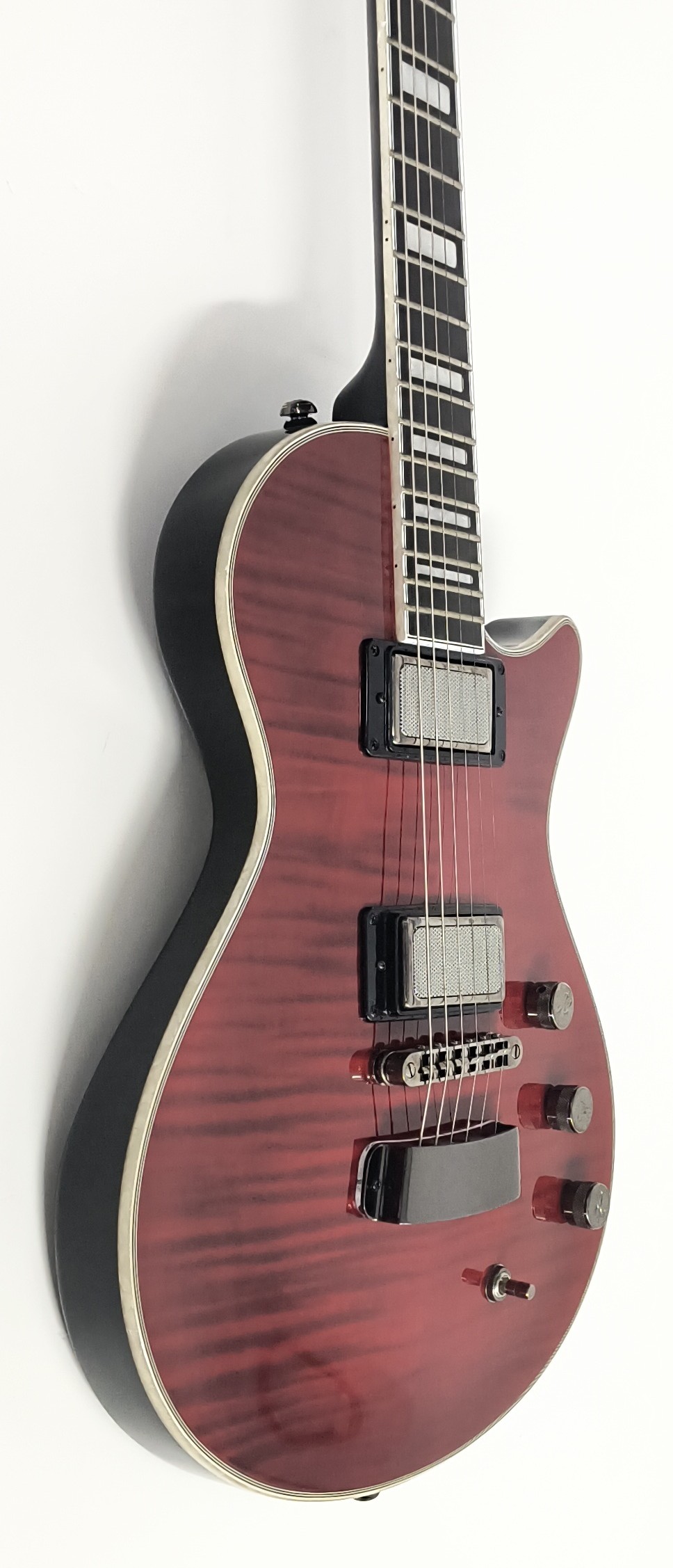Regler: Steg PU Volume, Hals PU Volume, Master Tone mit globaler Coilsplit Option (Push/Pull) die beide Humbucker auf SC Modus umschaltet